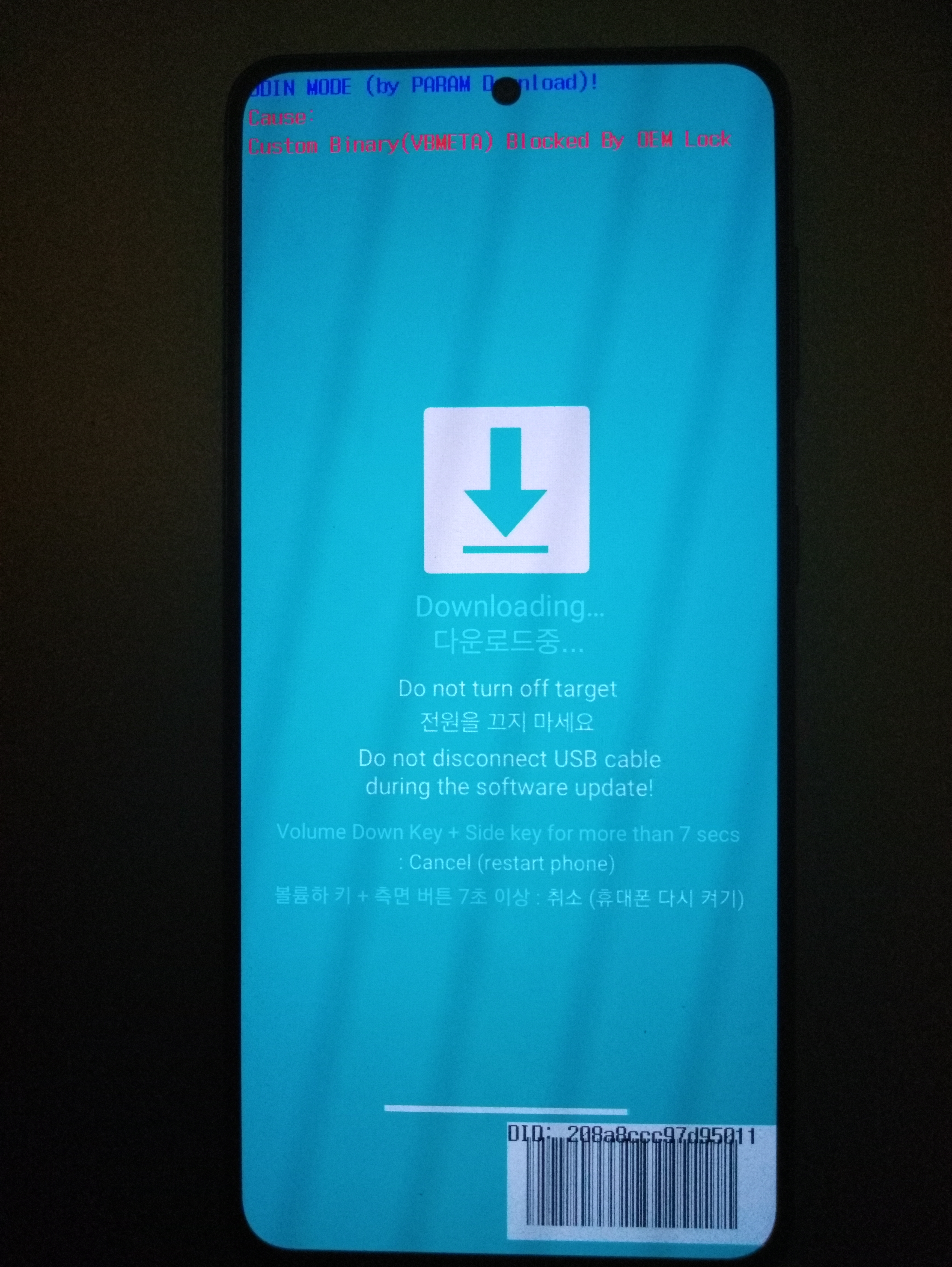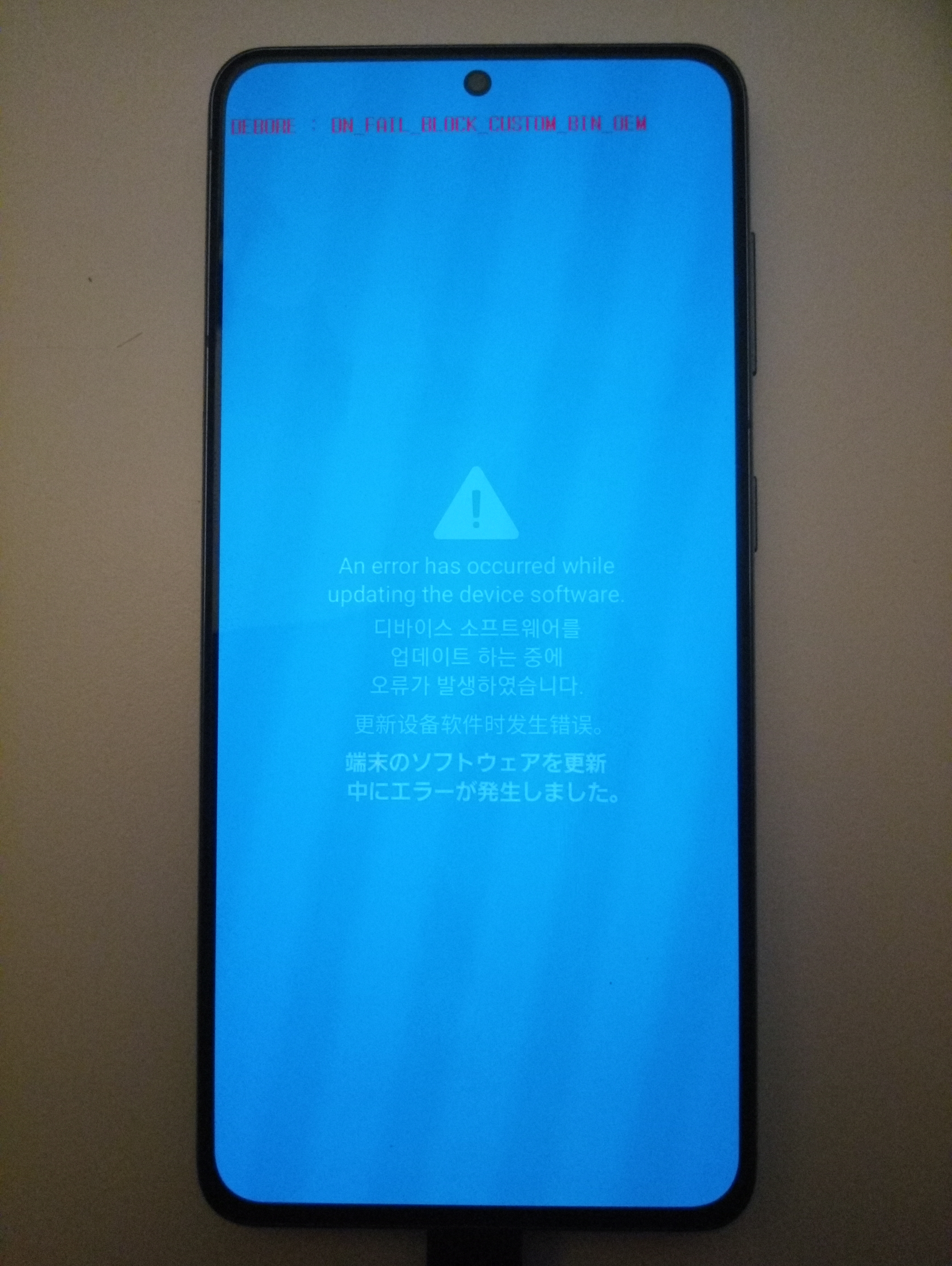 Zuerst hatte ich das Flashen (per Odin, ROM über Frija erhalten und mit Magisk gepatcht) sogar ohne das eigentliche Unlocken probiert (dachte, dass das Aktivieren in den Entwickleroptionen schon reichen müsste), bekam dann aber eben diesen Screen: