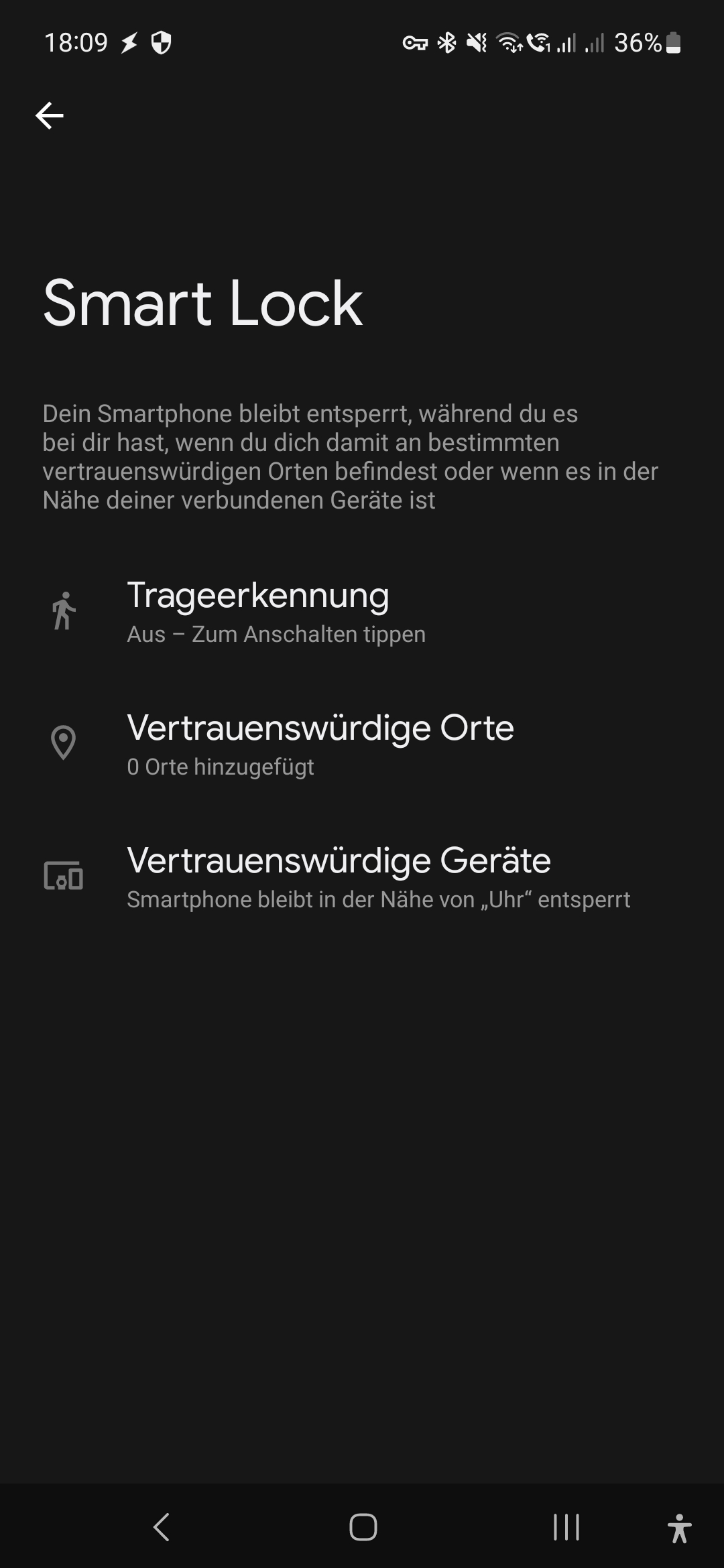 Natürlich habe ich geprüft, ob beide Geräte wieder verbunden waren, was der Fall war. Also in die Smart Lock Einstellungen. Sie sind verschwunden. Soll heißen, wenn ich dann in die Smart Lock Einstellungen gehe, sehe ich nur ein leerea Menu, siehe Bild. Ich schiebe gleich ein Bild nach, wie es sonst aussieht, muß dafür noch neustarten.