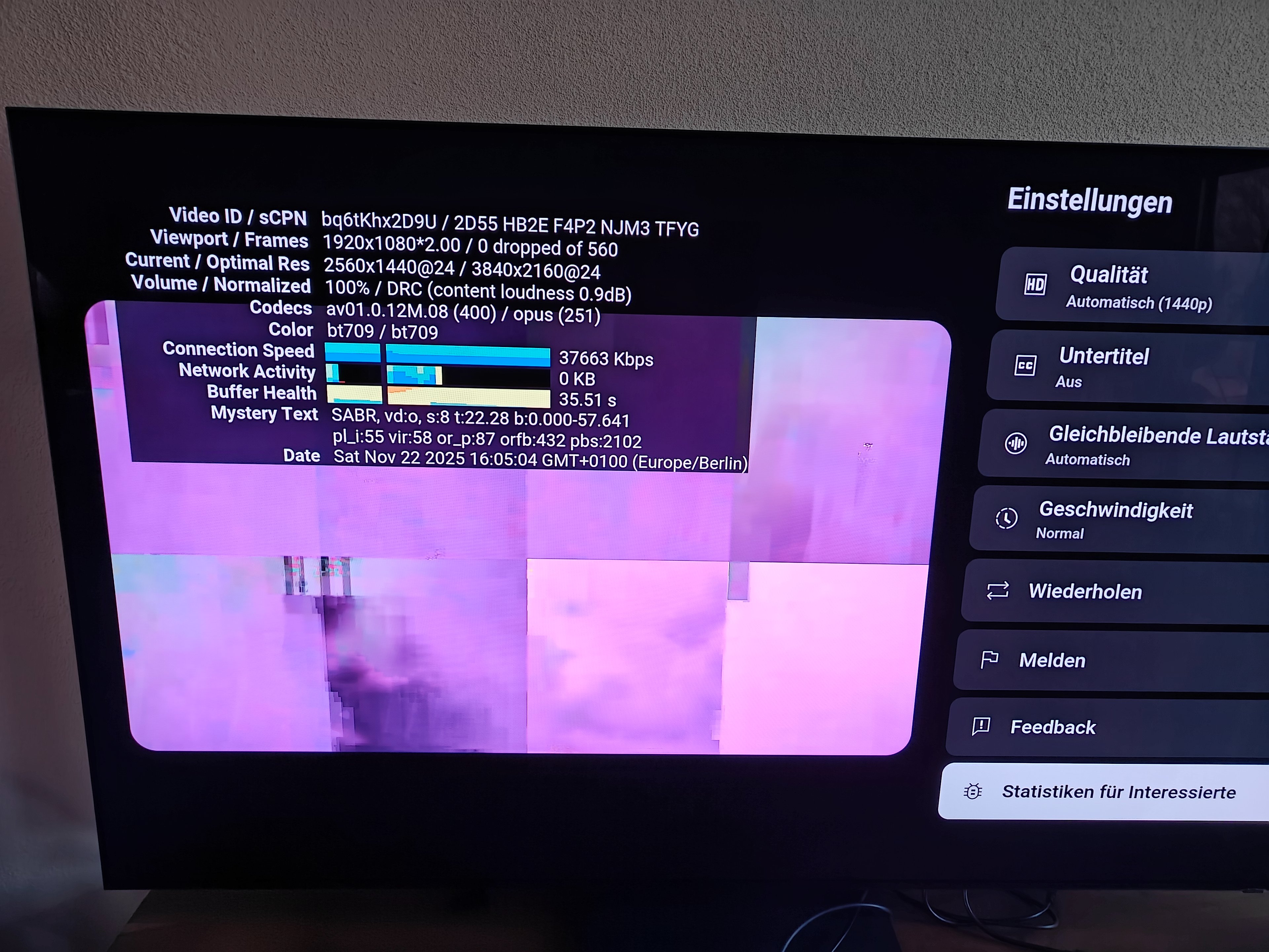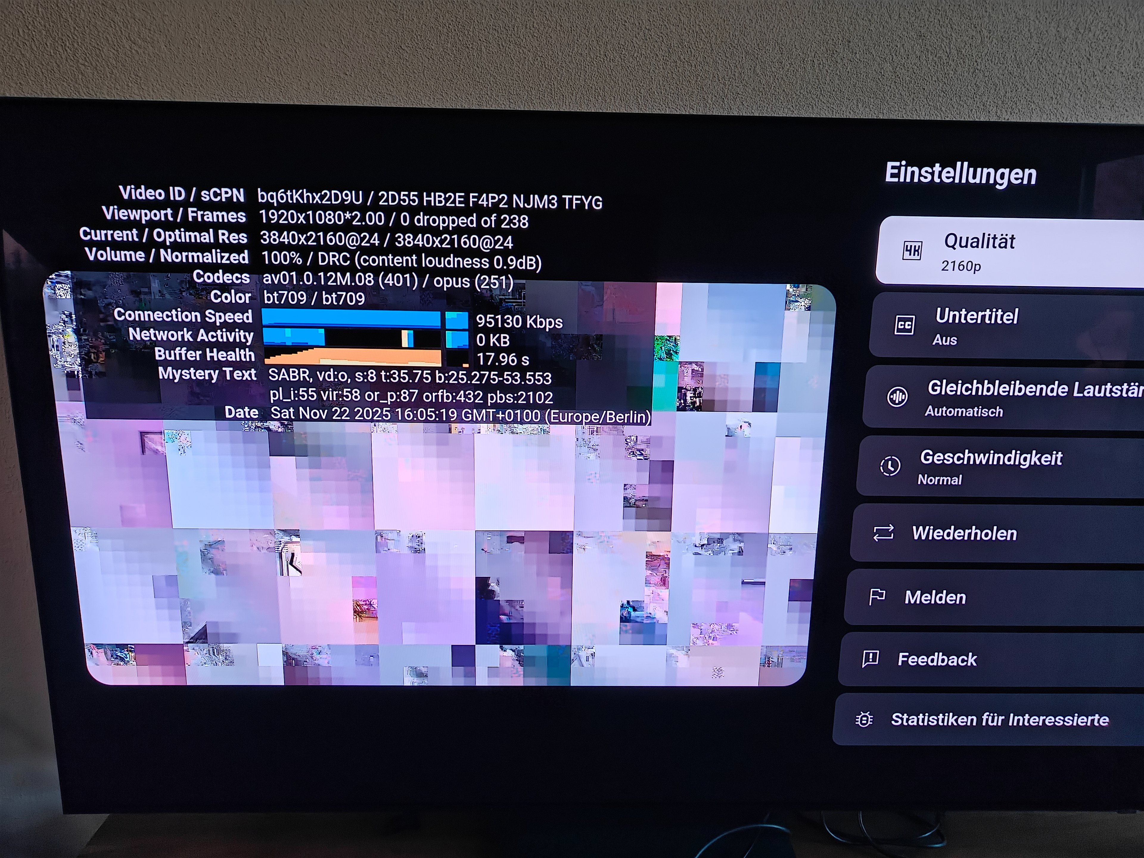 habe mir gestern den GQ65S93FAT von Euronics gegönnt. Heute früh stelle ich fest, dass bei einigen 4k Videos (überwiegend DJ Sets) das Bild total verpixelt ist und lauter Bildartefakte (falls die so heißen) zu sehen sind. Irgendwelche 4k DJ Sets funktionieren nicht, ein random 4k Tiervideo von Youtube wird problemlos abgespielt.