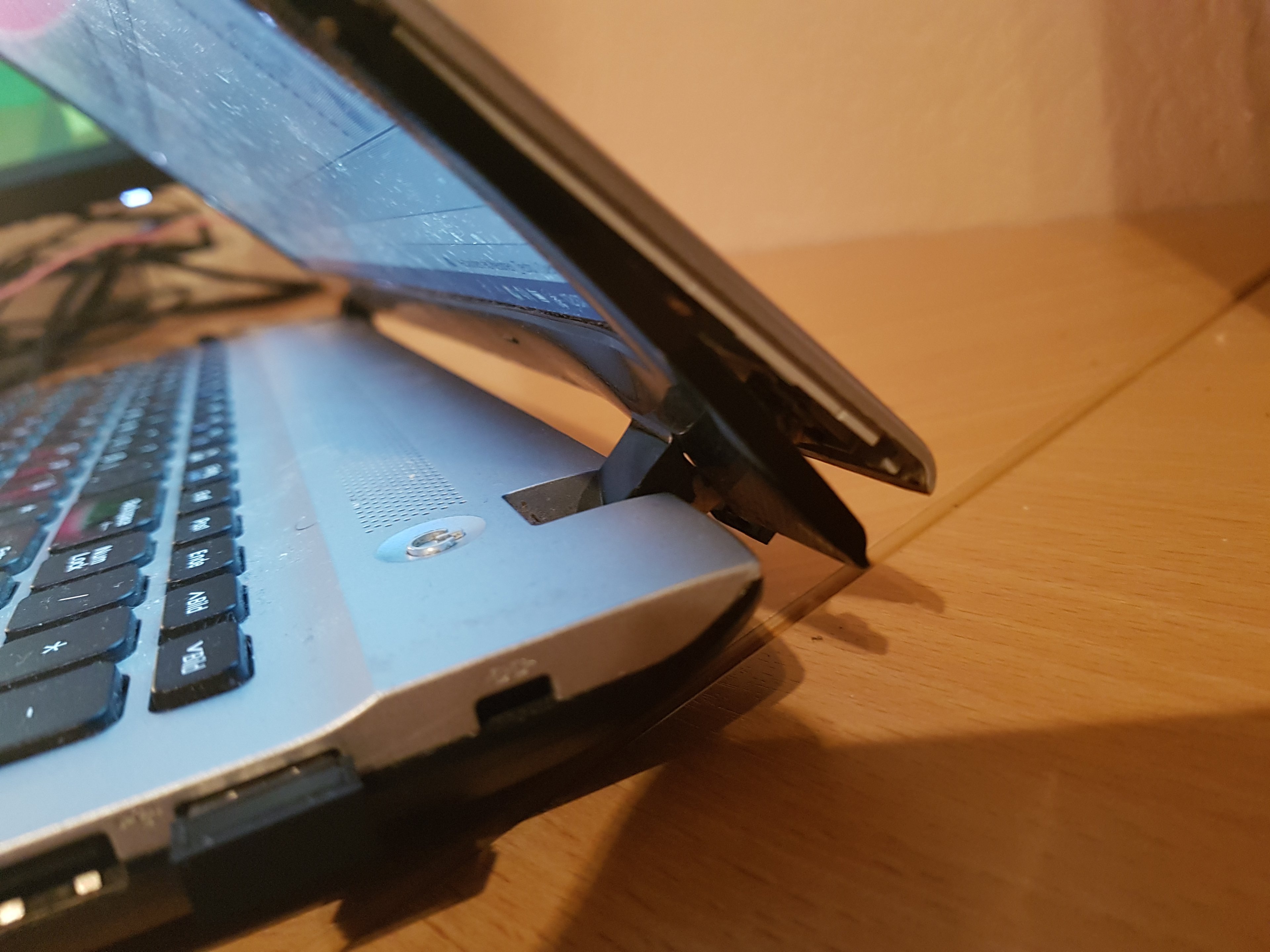 Beide Scharniere links und rechts sind gebrochen, das sich beim schliessen der Displayrahmen vom Display löst.