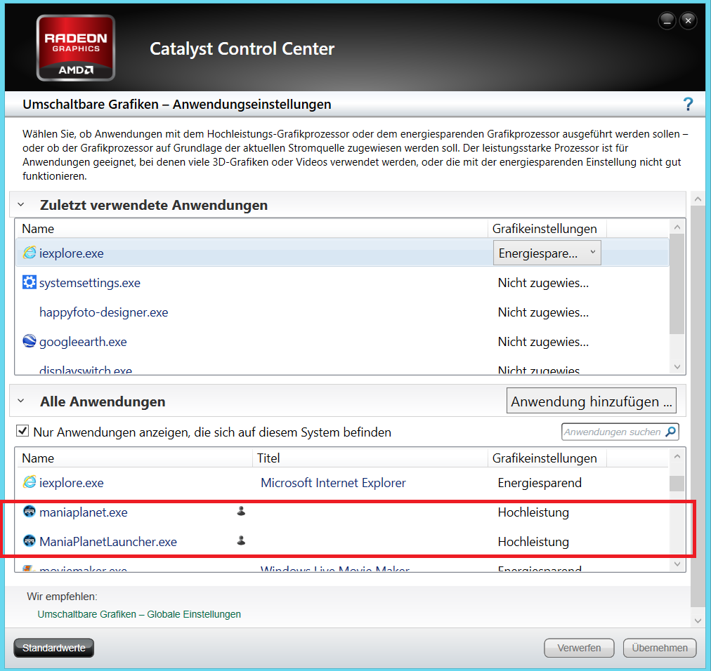 Hier habe ich bspw. für das Spiel "Trackmania" den Launcher und auch das Programm selbst "Hochleistung" ausgewählt. Das sollte ja heißen, dass das Spiel dann mit der AMD Grafikkarte startet.
