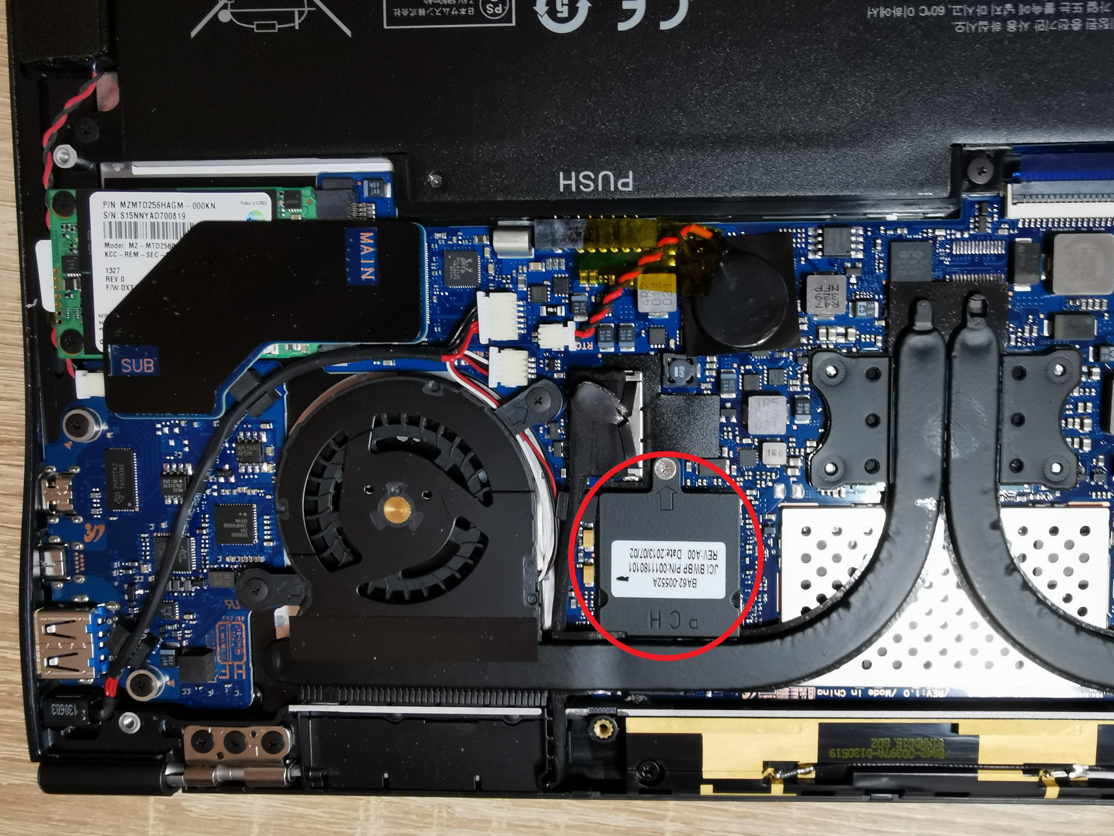 Also ich habe mir die Mühe gemacht über Google mal zu schauen, wo da der Arbeitsspeicher überhaupt ist. Der sollte im Rot markierten Bereich unter dem Blech drunter sein. Einfach mal die Schraube lösen und nachschauen.