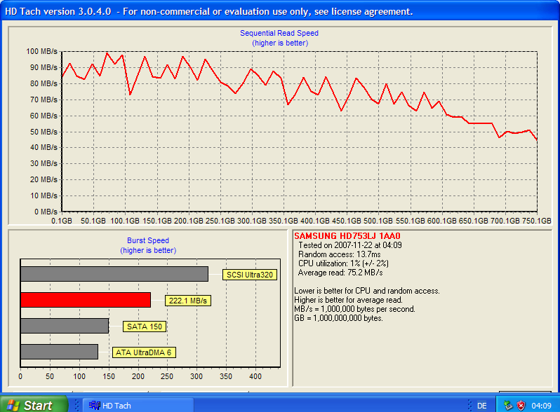 Jeweils mit HD-Tach und HD-Tune gemessen, bei allen sind die Transferraten etwa bei 75-76 MB/S Average. Bei HD-Tune ein paar MBs weniger.