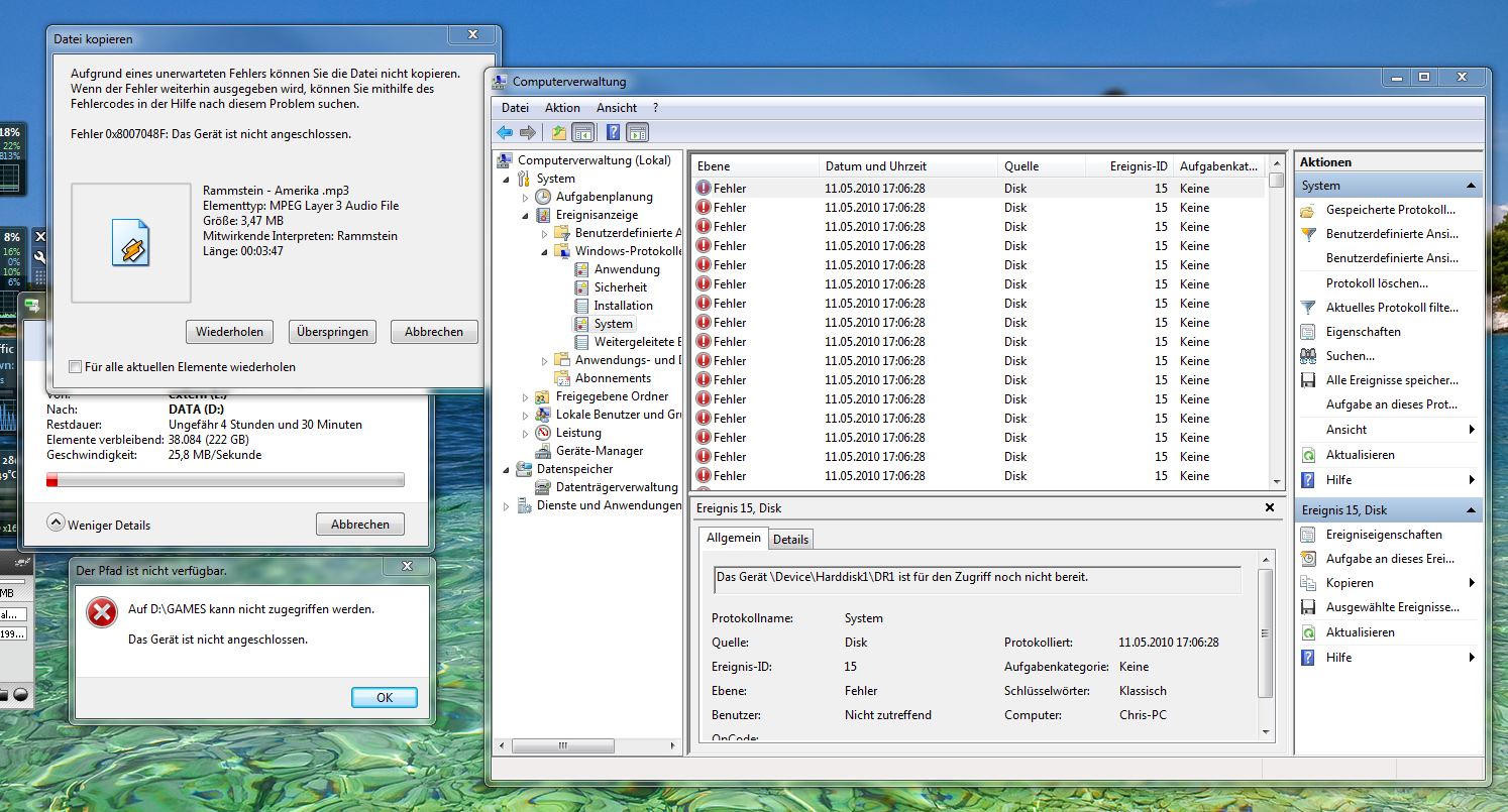 in der systemsteuerung sieht man die fehler, diese reichen übrigends über das KOMPLETTE protokoll, und es ist immer der selbe