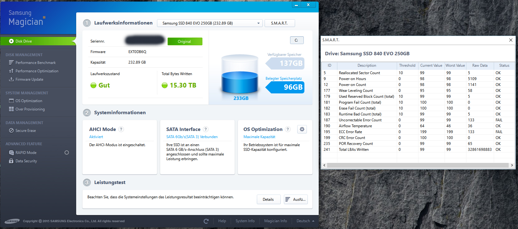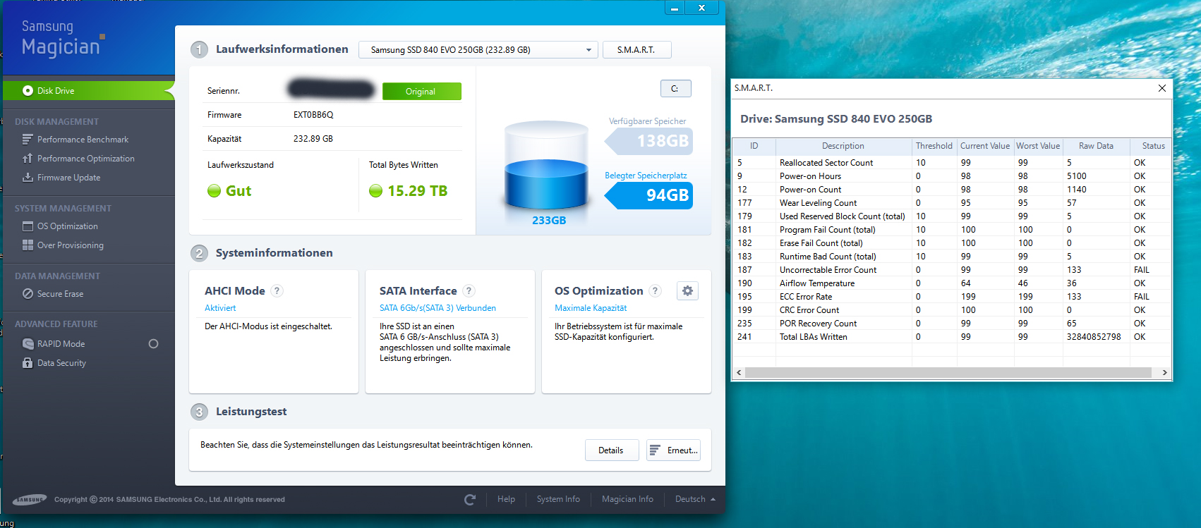 Meine Samsung SSD 840 EVO 250GB gekauft am 15. Januar 2014 über Amazon.de weißt 2 Fail-Werte aus unter Samsung Magician 4.5 und nun weiß ich nicht ob diese eventuell bedenklich sind bzw. was sie bedeuten?