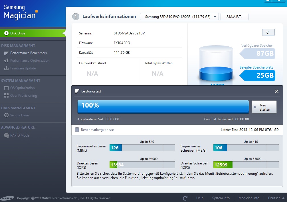 hab mir neulich eine SSD von Samsung geholt. Die EVO 840 mit 120GB. Das Magician Tool was beiligt hab ich installiert und wollt mal gucken was der Leistungstest so sagt.