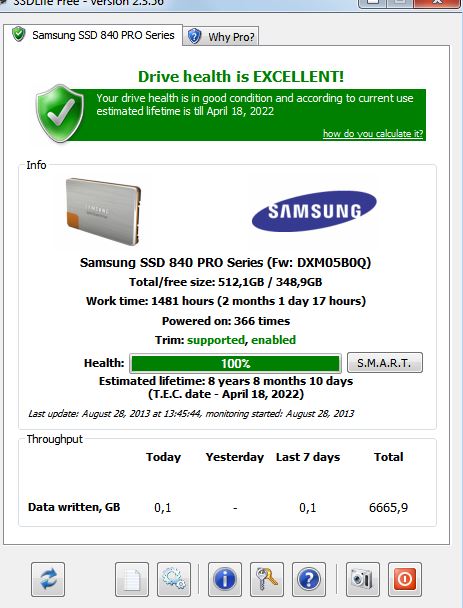 Natürlich kann keiner eine fixe detaillierte Antwort nach der Lebensdauer geben, ich möchte es aber trotzdem von euch gerne wissen, wie ihr folgendes Bild (im Anhang) deutet. Habe die SSD seit Februar, die Samsung SSD 840 Pro mit 512 GB bin super zufrieden. SSD life spuckt mir aus, restliche Lebensdauer noch 8 Jahre, Crystal Disk das im Anhang erwähnte Bild - Screenshot.