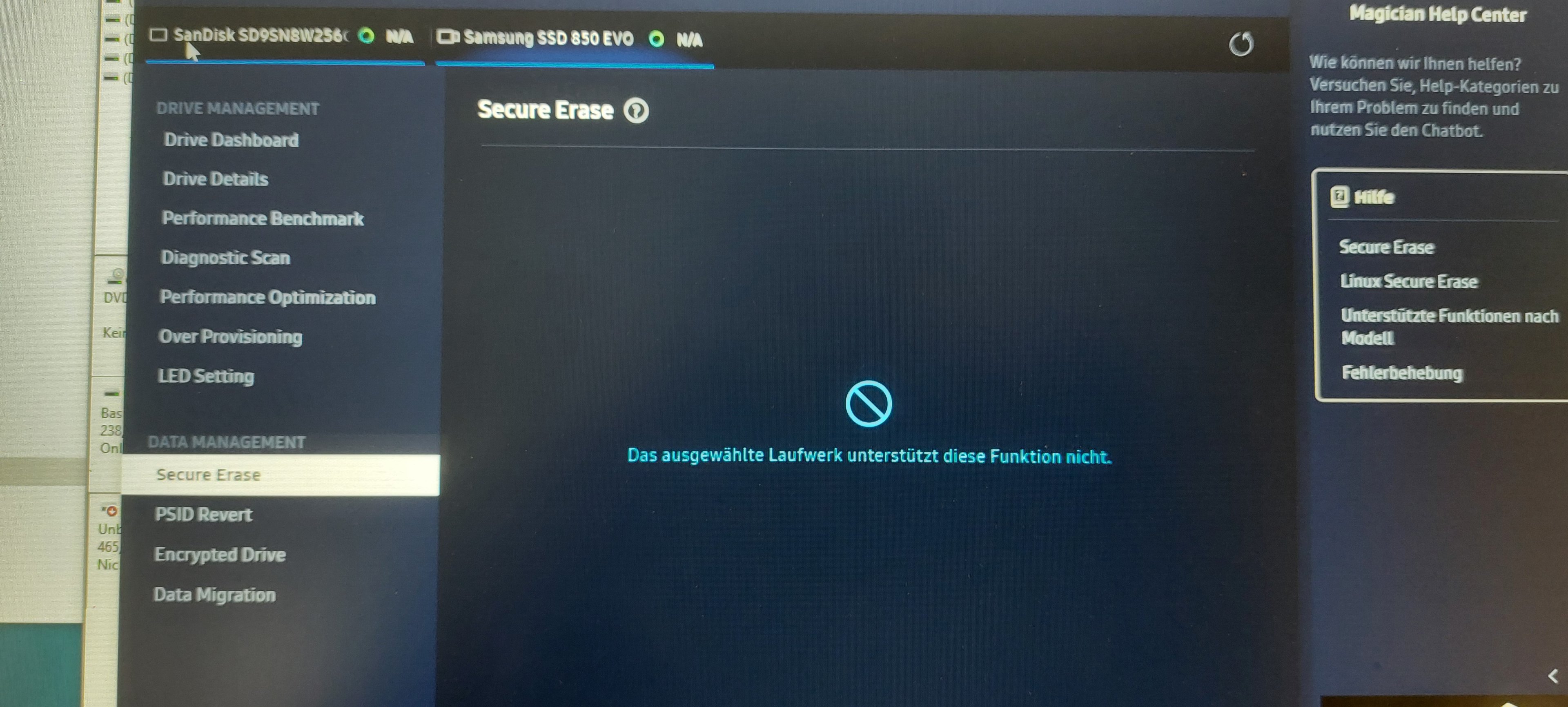 Nun zu meinem Problem: Wenn ich samsung magician starte und auf secure erase klicke und die ssd auswähle, kommt folgende Fehlermeldung: Das ausgewählte Laufwerk unterstützt diese Funktion nicht.
