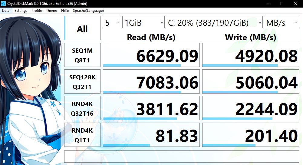 Deine 4K-Werte sind aber recht bescheiden, da habe ich ja mit "nur" PCIe3.0 sogar 92/225 MB/s... Offensichtlich hast Du keine echte 980Pro, sondern die PM9A1. (darauf weisen auch die 1907GiB Gesamtkapazität hin, statt 1863GiB)