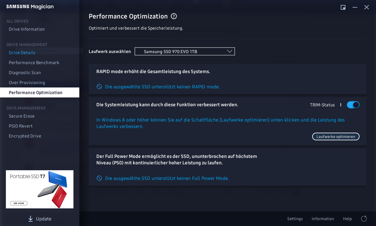 Seit dieser Woche ist Samsungs SSD-Toolbox Magician in der Version 6.3.0 verfügbar, die NVMe-SSDs von Samsung in den so genannten „Full Power Mode“ (FPM) versetzen kann. Ist der Modus aktiviert, soll die Samsung 980 stets mit voller Leistung agieren, indem sonst aktive Stromsparmodi deaktiviert werden. WD liefert im Dashboard für die WD_Black-SSDs mit dem „Game Mode“ eine vergleichbare Funktion.