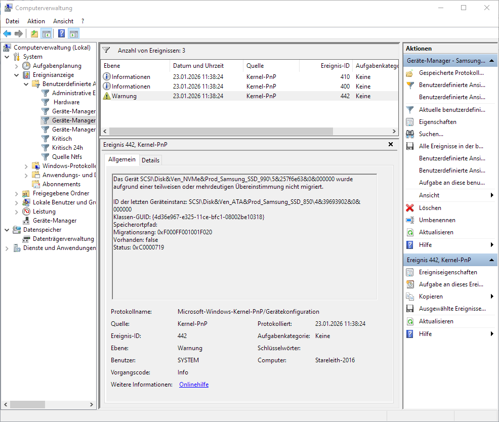 Die Geräteeinstellungen für SCSI\Disk&Ven_NVMe&Prod_Samsung_SSD_990\5&20eec198&0&000000 wurden aufgrund einer teilweisen oder mehrdeutigen Geräteübereinstimmung nicht von der vorherigen Betriebssysteminstallation migriert.