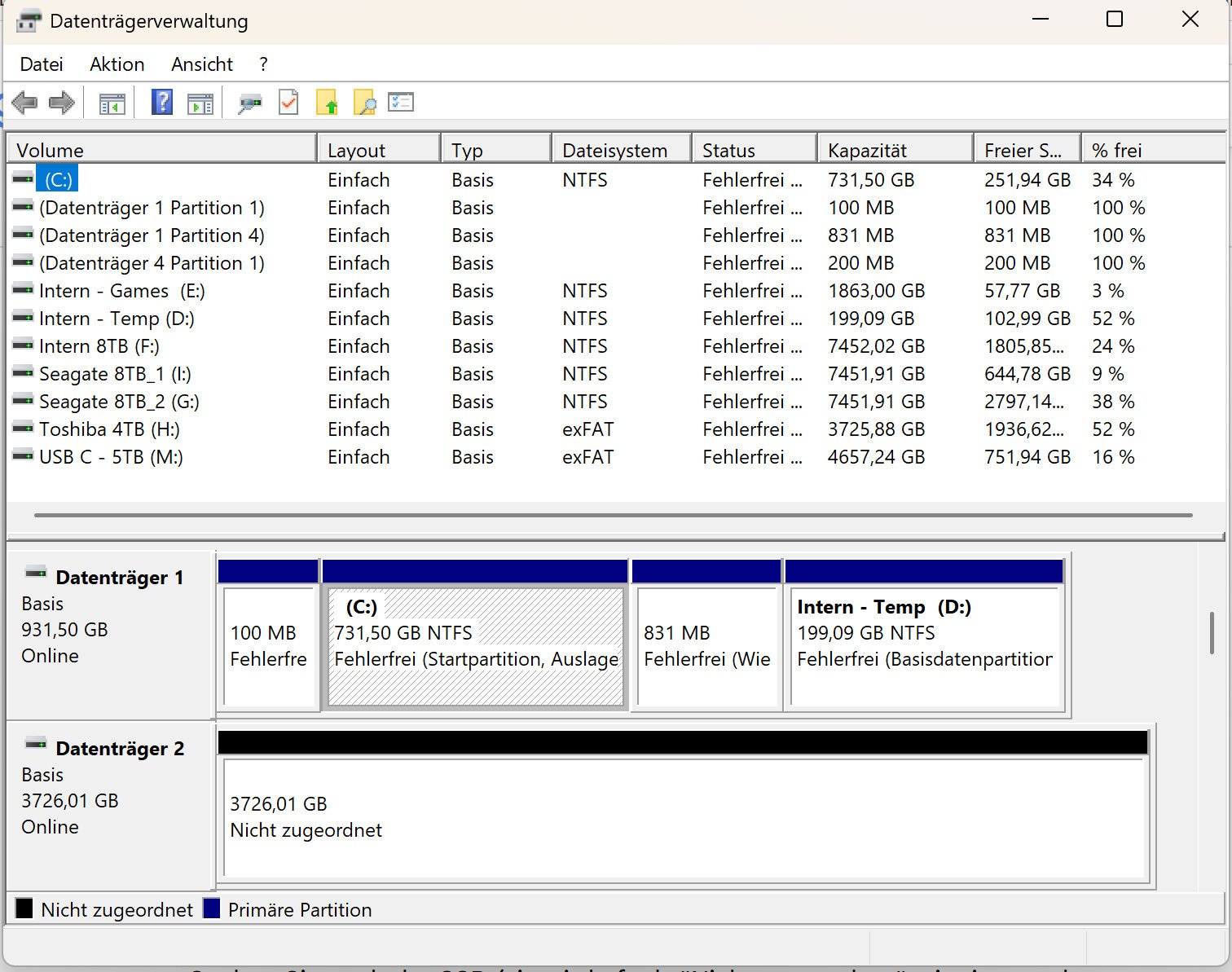 Die Datenträgerverwaltung von Windows (11) zeigt das Laufwerk ebenfalls nicht an.