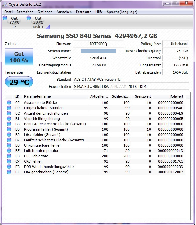 Und poste bitte mal den Screen von CrystalDiskInfo (die Portable Edition reicht und ist frei von Werbung), wenn sie dort erscheint, ziehe aber bitte das Fenster soweit auf, dass alle Attribute und auch die Rohwerte vollständig sichtbar sind.