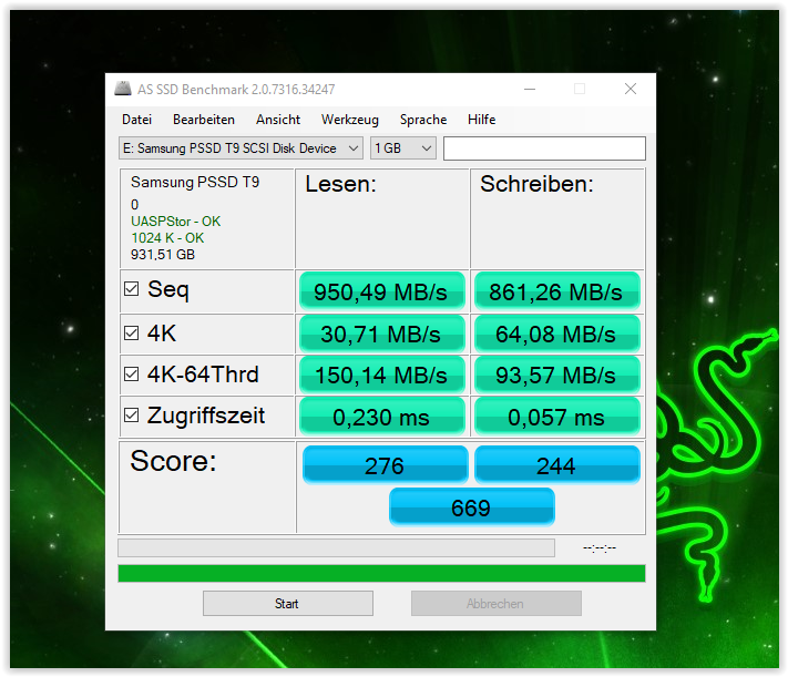 Habe die Samsung SSD externe gekauft.Habe Benchmark gemacht mit dem Program AS SSD Benchmark,und mit Samsung Magician Programm.