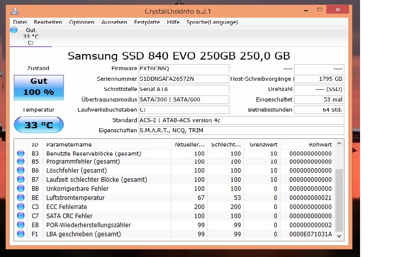 Sooo. Ich gebe es auf. Habe die SSD noch mal komplett Formatiert und mein eigenes Windows 8.1 Pro drauf gespielt. Er gab alles keine Besserung. Laut Acer Support hat das Netbook einen SATA 3 Anschluss auf Port 0 der bis zu 6GB/s kann. Warum auch immer jetzt nur noch 3GB/s genommen werden weiss keiner. Ich bin mir auch zu 100% Sicher, dass vor benutzung der Samsung Optimierung Sata 3 mit 6Gb/s in der Magician Software angezeigt wurde und warum sollten die Benchmarks vor dem Optimieren dann auch über 500 Mb/s Anzeigen. Ich habe jetzt die möglichkeit die Platte zu Samsung zu schicken oder ich lasse es einfach so laufen. Nutze das Netbook nur fürs Internet (SkyGo, Ebay usw.) und für Microsoft Office und Email Arbeiten. Zum Spielen wird es nicht genutzt. Vermutlich merke ich den unterschied als normal Nutzer zwischen 280Mb/s zu 530Mb/s gar nicht.