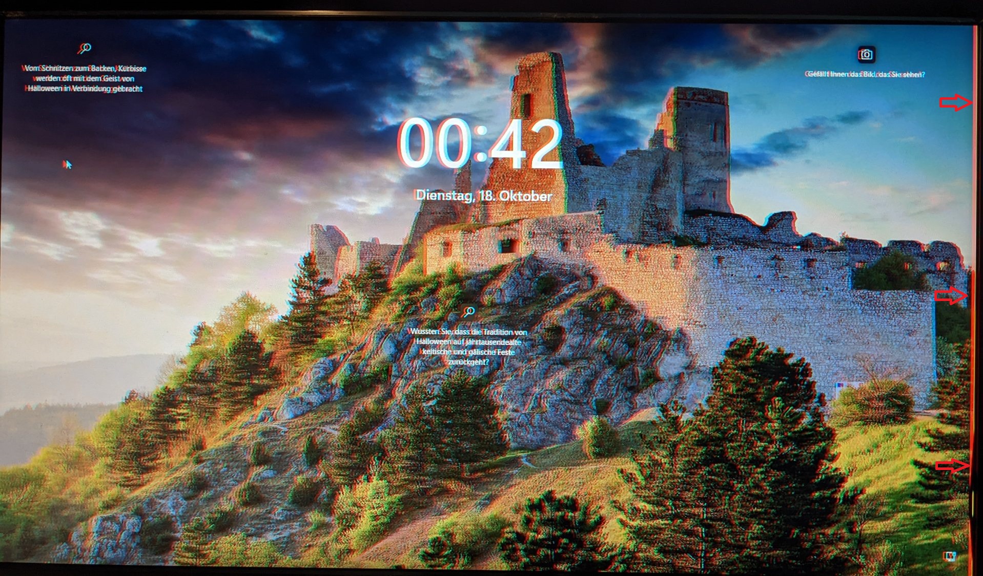 - das Bild unscharf und leicht verschoben ist, mit Farbrändern an den Konturen, rot oder grünem vertikalen Balken am Rand