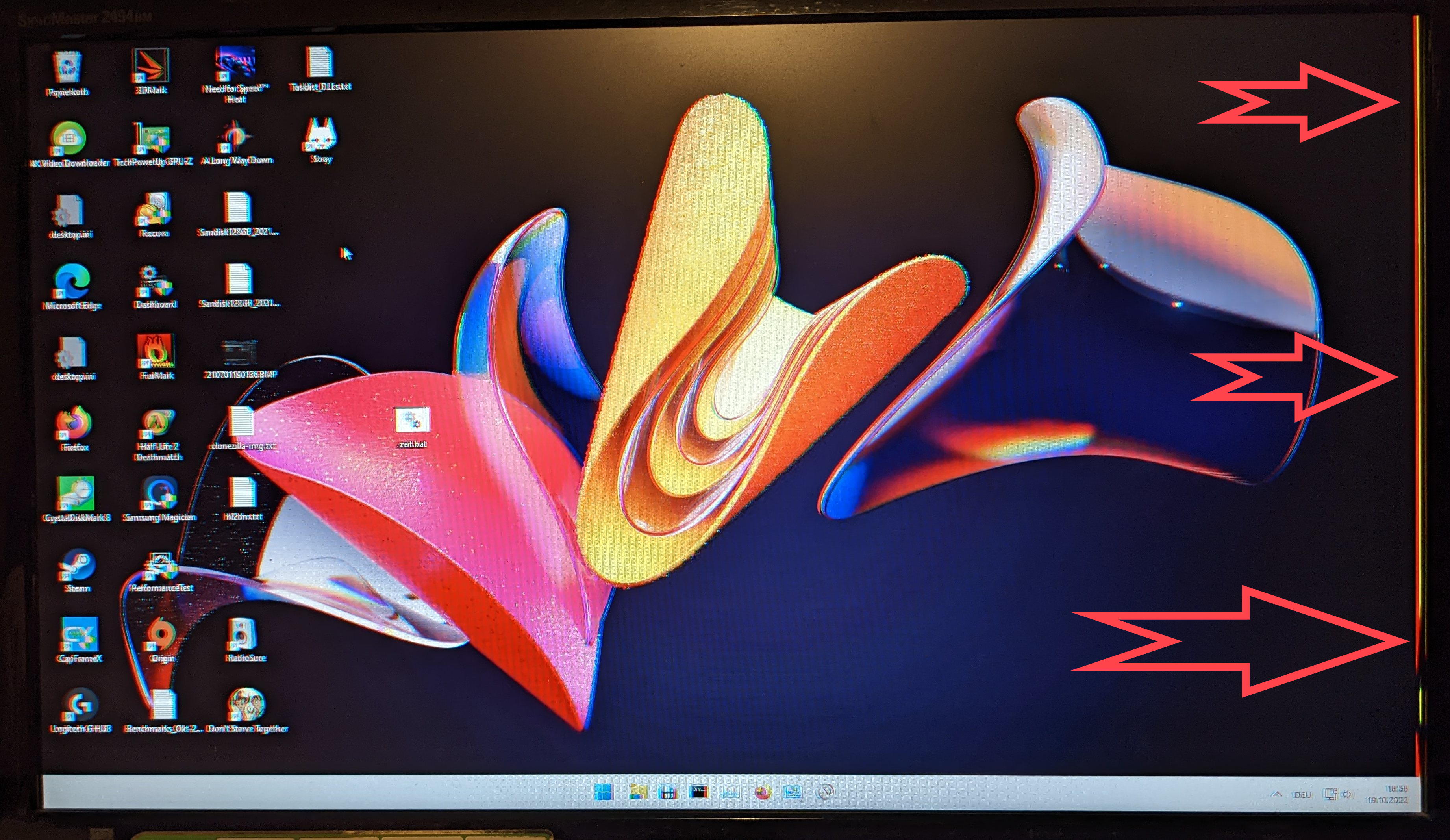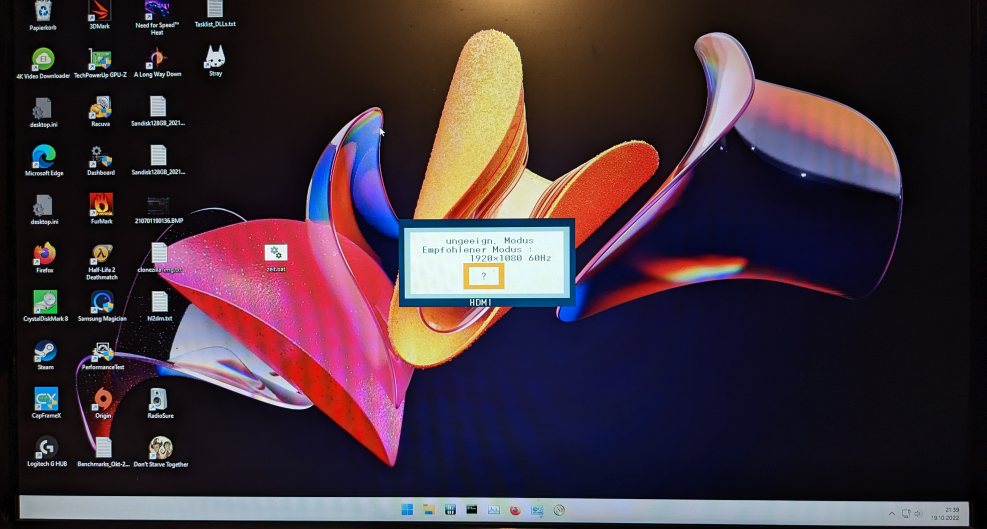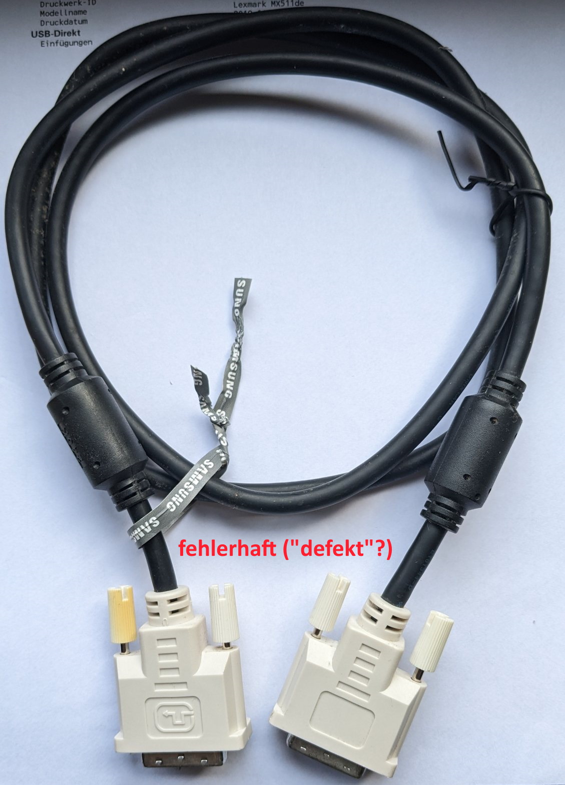 Betroffen hiervon ist aber nur der DVI-Eingang. Daran hängt eine Sapphire Pulse 5700XT, über einen Adapter Display Port->DVI, und ein DVI-Kabel. Am HDMI-Eingang (verbunden mit anderem PC, mit Intel HD4000 von i5-3570k gibt es das Problem nicht. Auch beim Durchschalten der Eingänge mit der "Source"-Taste ist die Anzeige vom HDMI-Eingang immer ok, während das Problem am DVI-Eingang weiter besteht.