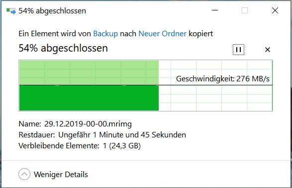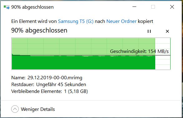 - auf die externe Samsung SSD werden die Daten von der im Rechner verbauten SSD Corsair Force MP510 1920GB NVMe PCIe Gen3 x4 M.2 kopiert