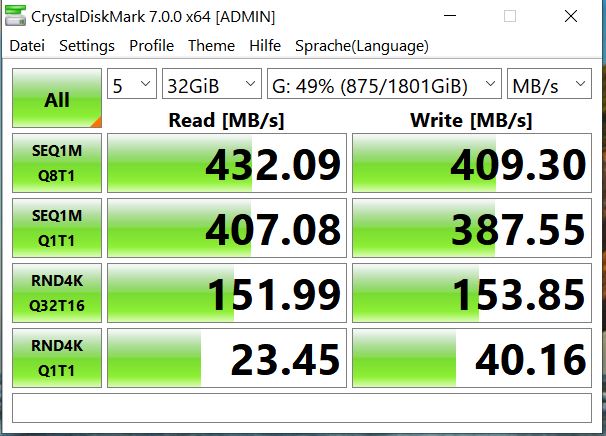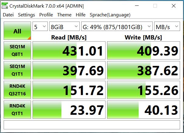 Die CrystalDiskMark Testergebnisse sehen dagegen nicht so schlecht, siehe Screenshots.