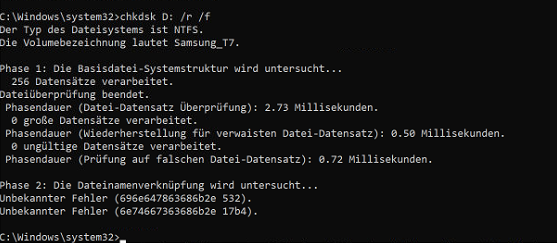 Beim Ersten Versuch Daten auf die T7 zu Kopieren ging eine Fehlermeldung mit dem Code „0X8007045D“ auf. Nach etwas Recherche noch der Versuch mit „chkdsk /r /f“ das Problem zu lösen. Doch auch hier nur zwei Fehlercodes die mir nicht nennenswert weitergeholfen haben. (hier damit ihr sie nicht abtippen müsst: „696e6447863686b2e 532“ und „6e746647363686b2e 17b4“)