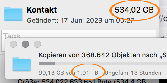 Ich habe es übrigens einmal im Finder probiert und einmal mit Carbon Copy Cloner, beide Male dasselbe Ergebnis. Auf die SSD werden immer mehr GB geschrieben, als die ursprüngliche Datei groß ist. Im Anhang mal ein Screenshot, hier hat der Quellordner zum Beispiel 534 GB, geschrieben werden aber 1 TB. Gibt es da eine Erklärung für?