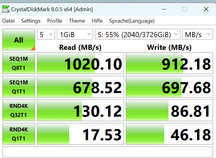 Ich hab die Platte an meinem Miniserver dran der auch nur USB3.2 G1 hat dran und ich finde die Werte soweit absolut in Ordnung (oben ohne, unten mit cache, das DD ist ein Schreibtest, achtung hier wird der cache natürlich mitspielen daher der hohe Wert), allerdings ist das Ding ext4 formatiert: