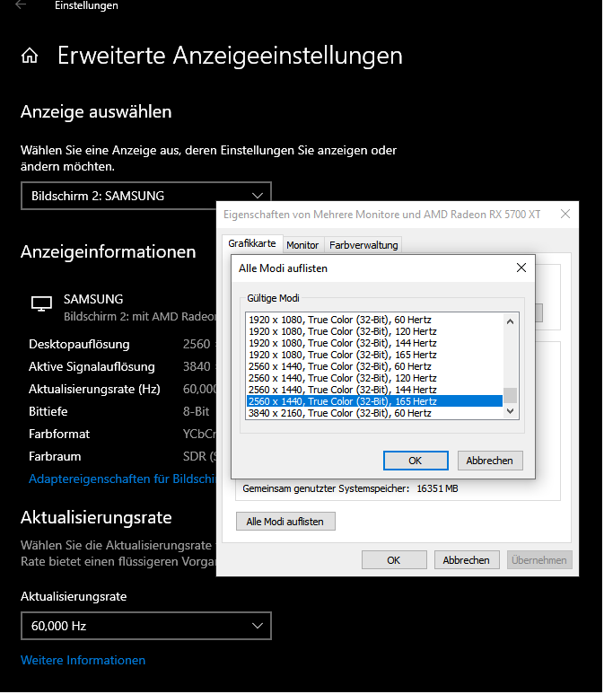 ich möchte von meinem PC mit einer AMD 5700 XT Karte ein Spiel auf meinen Samsung TV (KS7090) ausgeben. Laut Datenblatt hat dieser 100 Hz. Dafür habe ich ihn in den Spielmodus gestellt. Allerdings zeigen mir die Anzeigeeinstellungen in Windows 10, dass der Monitor maximal 60 Hz ausgibt. Woran kann das liegen?