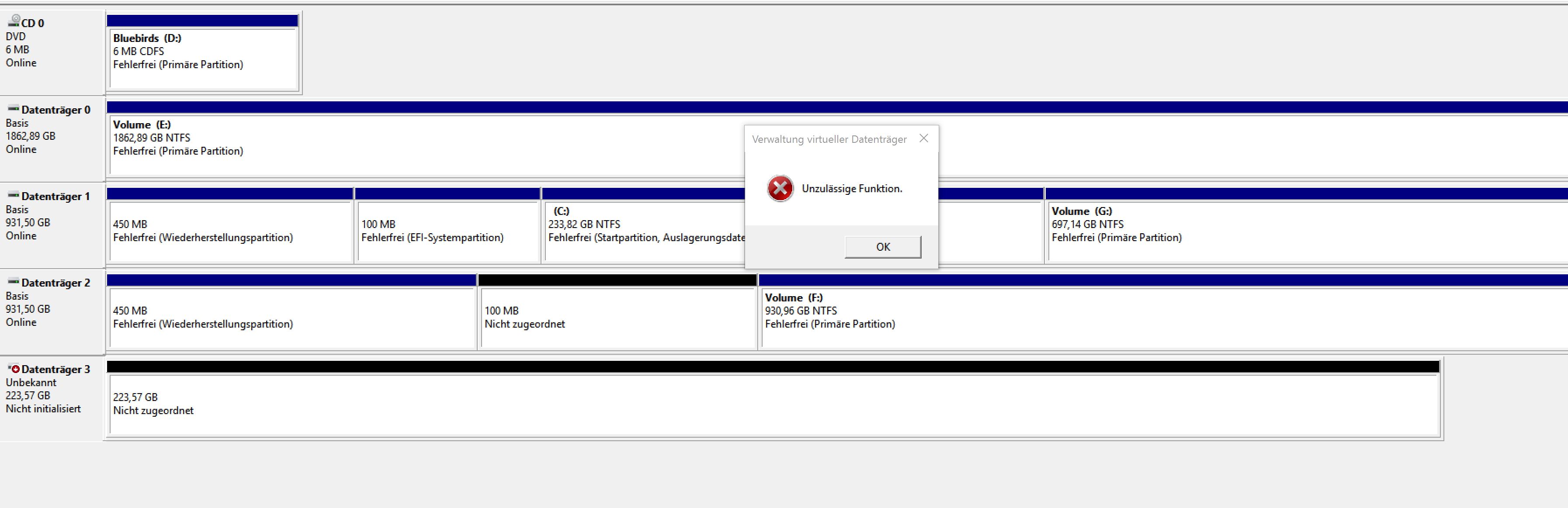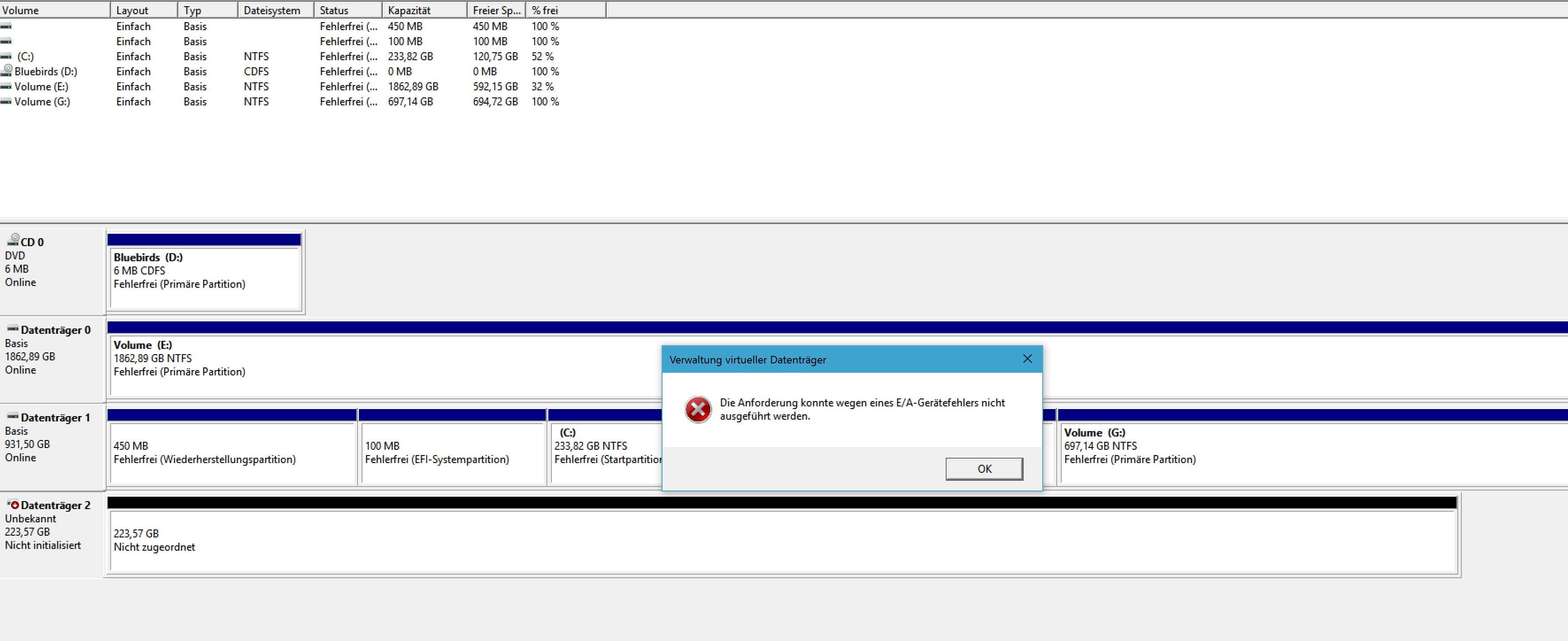 Jetzt habe ich mir ein neues SATA-Kabel besorgt, da ich auch das wiederum nachgelesen habe und an einen SATA-Port 3 mit 6Gbps ist die Platte jetzt auch angeschlossen. Über Diskpart habe ich versucht die Festplatte zurückzusetzen, aber auch da bekomme ich nur E/A-Gerätefehler ausgegeben.