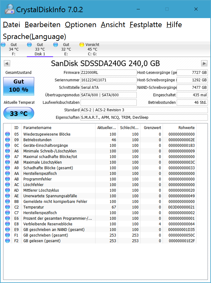 Über Crystal-Diskinfo wird die Platte erkannt und auch über die Datenträger-Verwaltung. Ich bin echt schon ziemlich am