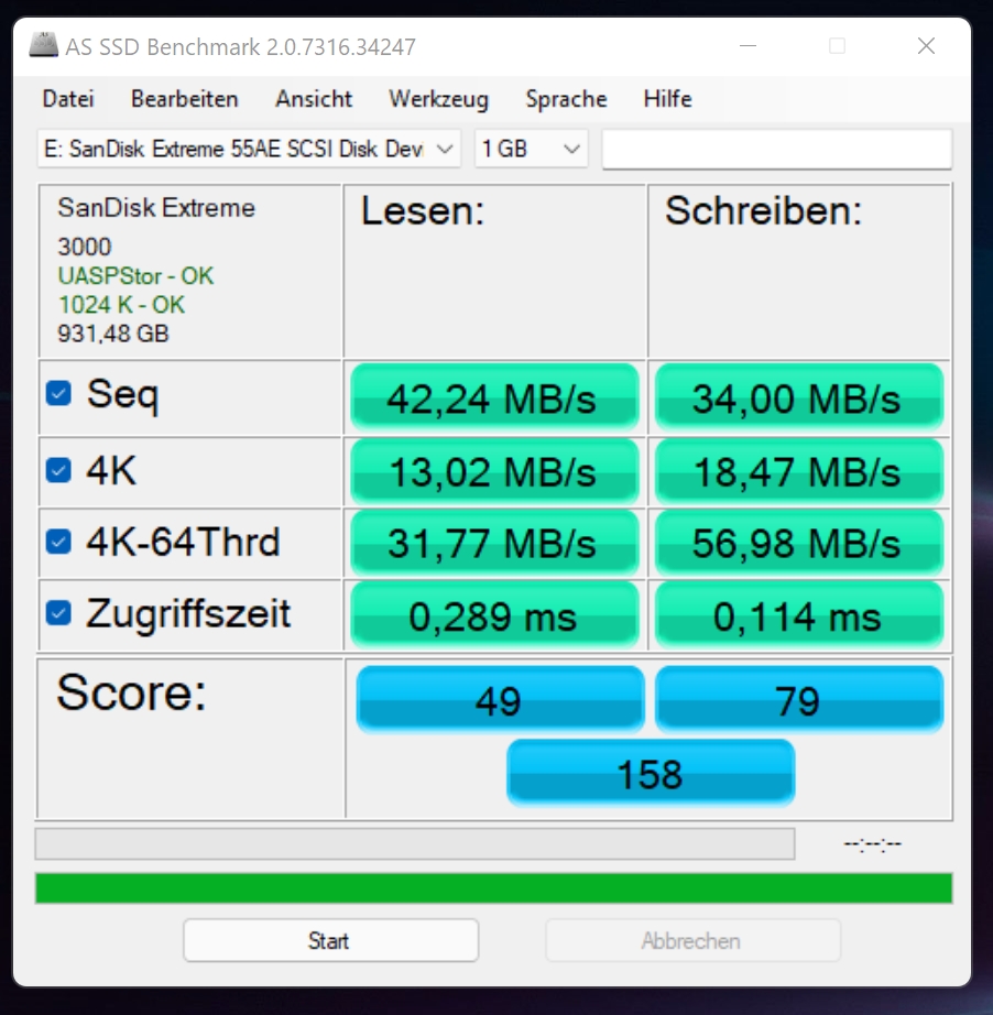 Das sieht so aus als hättest du sie per USB 2.0 angeschlossen, die sollte sequentiell die 500MB / Sekunde lesend knacken, bei dir sind es schlappe 42 MB/s.
