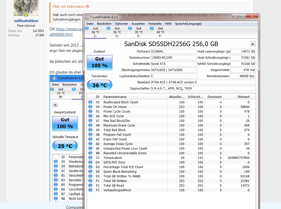 ich hab folgendes, schwerwiegendes Problem: Meine SSD hat sich einfach verabschiedet. Und das ohne offensichtlichen Grund, das letzte was ich tat, war CS:GO zu installieren und spielen. Den PC regulär ausgeschaltet, am nächsten Tag lief dann nichts mehr. Das Betriebssystem ist dort installiert, und viele wichtige Daten. Nun eine zweite Windows Installation auf eine meiner alten HDDs installiert, um den PC nutzen zu können. Aber weiter zum Problem: Die SSD wird bei den Laufwerken unter "Computer" im Explorer nicht angezeigt, wohl aber noch im Geräte-Manager und dem Programm "CrystalDiskInfo". In der Datenträgerverwaltung (in der ich nicht herumgepfuscht hab, keine Sorge) jedoch nicht. Alle Kabel sind noch genau wie zuvor eingesteckt, da wurde vorm Absturz der SSD also nichts verändert. Anzeichen auf ein Ende der Lebensdauer gab es auch keine, zumal sie noch nicht einmal ein Jahr alt ist. Achja, und im BIOS wird sie auch nicht aufgelistet. Außerdem hab ich beim Starten die Option zwischen beiden installierten Betriebssystemen auszuwählen - beim Starten über der eigentlich auf der SSD installierten Version kommen mir aber nur eine Menge Fehler entgegen natürlich. Aber finde ich interessant, dass die Option überhaupt noch anwählbar ist.