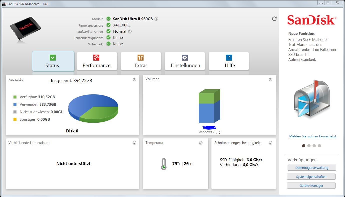 Das Sandisk Dashboard sagt alles im grünen Bereich. Keine auffälligen Werte. Die CRC-Fehler sind auch bei null.