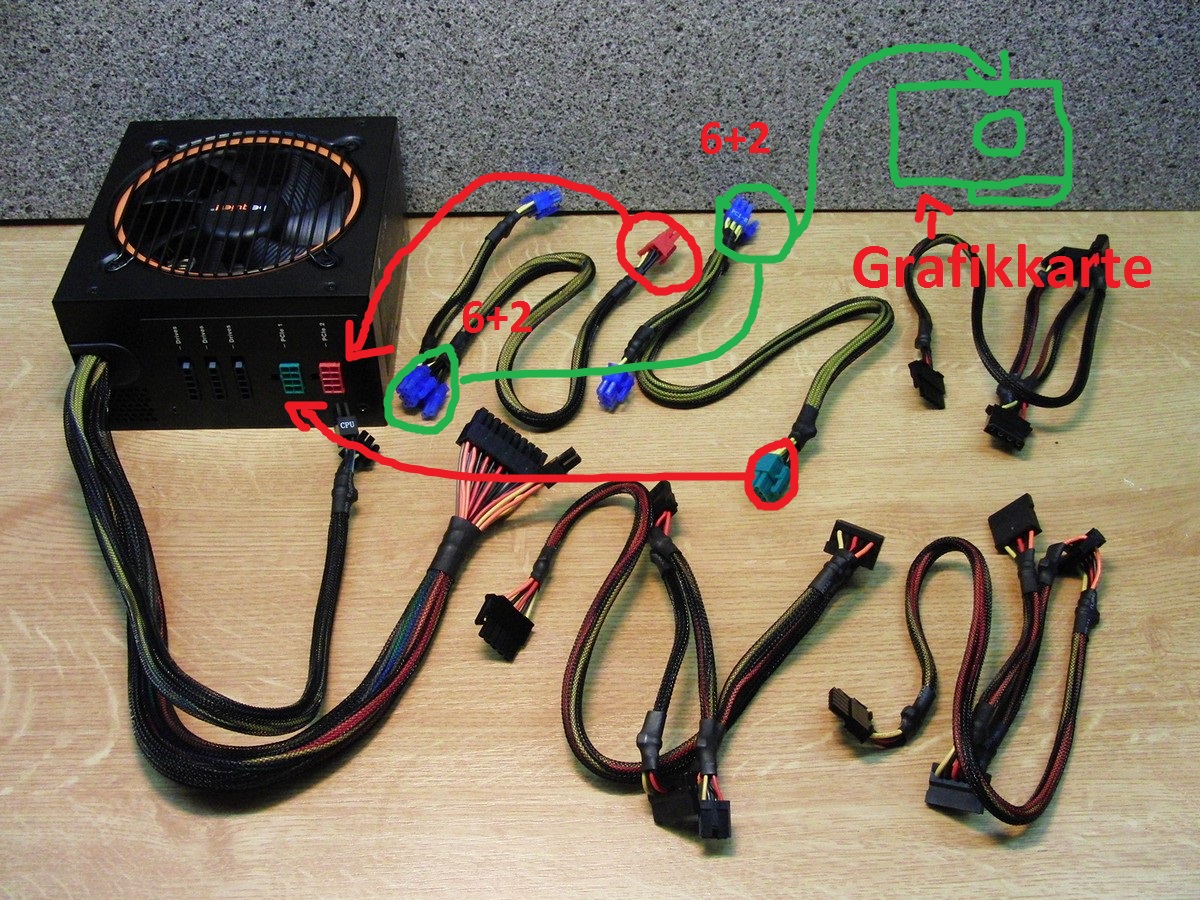 Soweit ich mich belesen und hoffentlich richtig verstanden habe, reicht das Netzteil für die Grafikkarte aus. Für das Netzteil habe ich ein Stromkabel, dass einmal 6+2-polig ist und einmal 6-polig (verzeiht meinen Ausdruck, ich hoffe ich sag' es richtig)