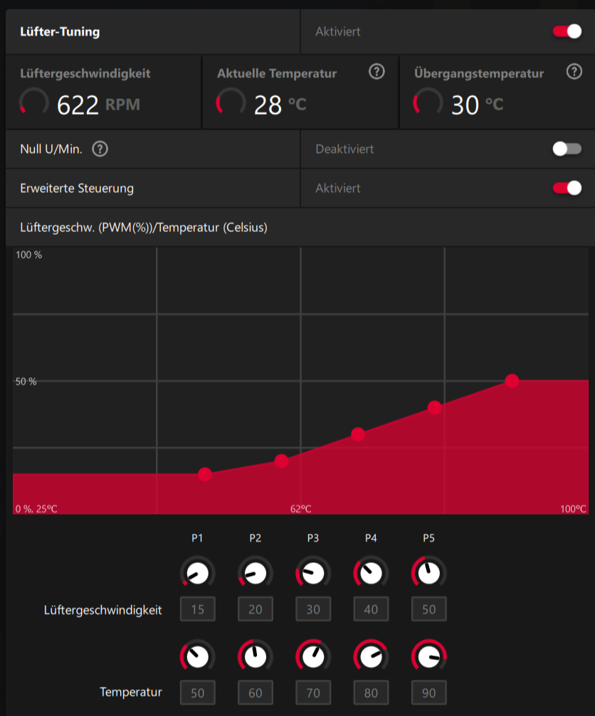 Hallo CB'ler, ich habe seit einem Monat eine Sapphire Pulse Radeon RX 6700 (vorher GTX 1050 Ti) und bin mit der Lüftersteuerung im 2D Betrieb nicht wirklich zufrieden. Im ZeroFan Modus kommt es gelegentlich z.B. beim Streaming vor, dass die Lüfter anlaufen da 50°C überschritten werden, weil der VRAM dann mit vollem Takt läuft. Leider laufen die Lüfter immer mit hoher Geschwindigkeit an um sich dann auf die Einstellungen der Lüfterkurve runter zu regeln. Das deutlich hörbare Anlaufen alle 10-15 Minuten ist schon störend.