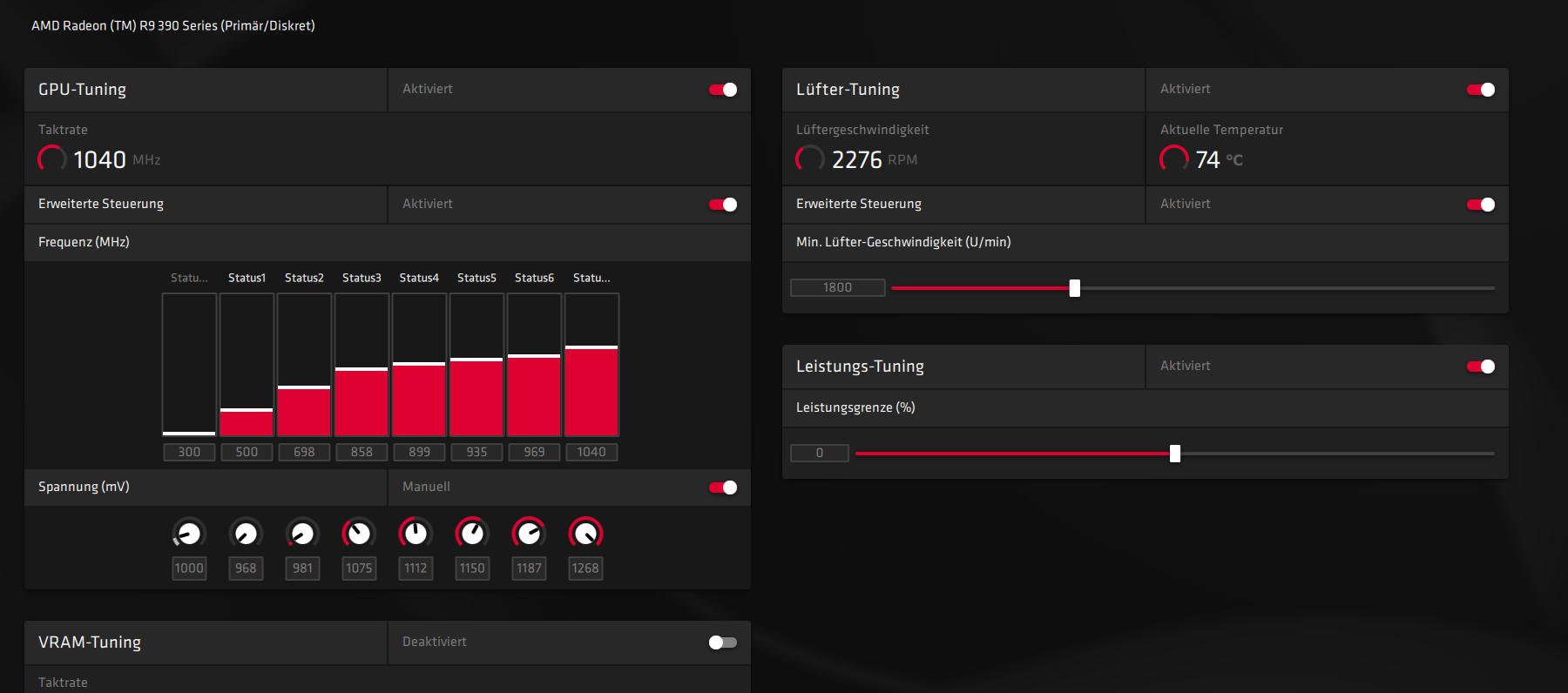 Ich finde hier im Forum zwar einen Thread, in dem es auch um die 390 geht, allerdings sind die meisten Beiträge schon recht alt und der Treiber scheint sich ja auch verändert zu haben. Manchmal liest man davon das mit der Radeon Software zu machen (dort ist dann nur ein Schieber vorhanden) oder mit dem Afterburner.