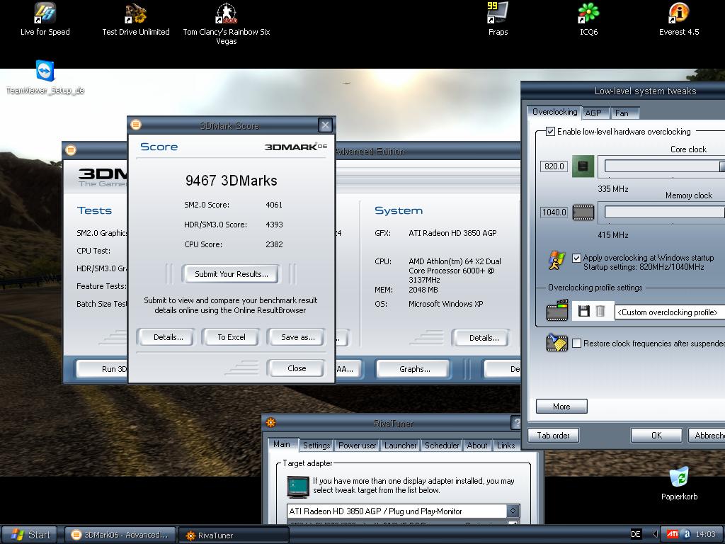 Der 3D06 zeigt: Ihre Stärken spielt die 3850 auch auf alten Systemen im Bereich Shader 3 aus. Hier sind Leistungssteigerungen von fast 50% drin. Trotzdem: Auf meinem System blieb ich selbst bei 3500 MHz Taktrequenz (mehr gibt die Luftkühlung nicht her) unter 5000 Punkte im 3DMark06.
