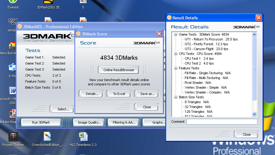 Tja mit rein Rechnerisch kann man ja viel Anfangen wenn man es nicht gesehen hat kann man nicht reden - Ne X800 Pro hat eine Shaderberechnungs zahl von 4X1 ergibt bei ihren Takt eine Pixel füllrate von 6,4 Gigapixels allein diese Füllrate hängt mit den Piplines zusammen je mehr Pipelines pro Takt desto mehr Füllrtate . Irgenjemand wollte doch noch die Detailierten werte des 3D Mark 05 haben - hier-