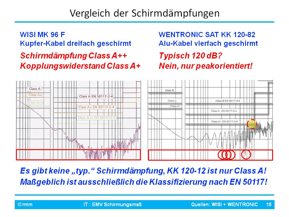 typischen Schirmdämpfungswerten beworben, die sich im Diagramm als einzelne Ausreißer darstellen. Das ist peakorientiertes Marketing. Wo typ. draufsteht ist wie bei den LNB-Rauschmaßlügen Vorsicht geboten, nach EN 50117 gibt es keine typ. Schirmdämpfung.