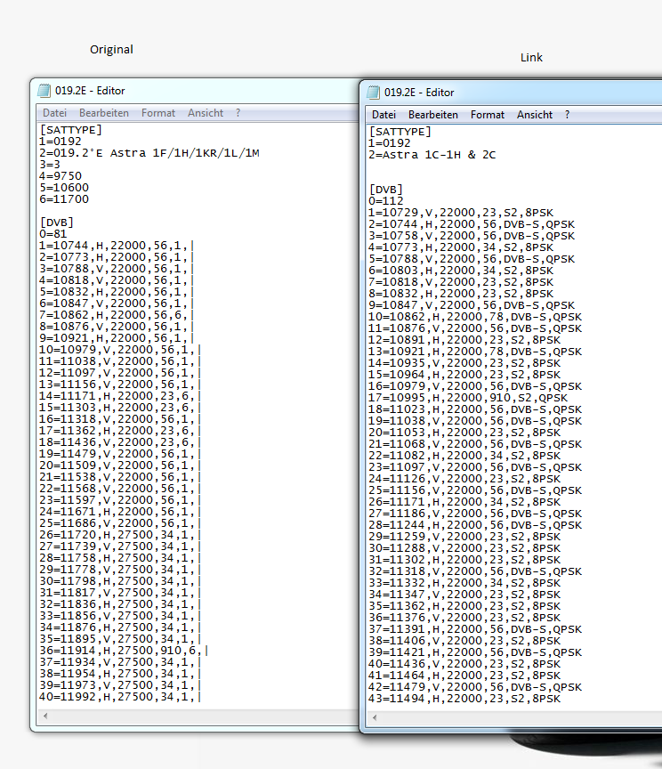 Ich hab ein kleines Problem mit meinem Satempfang. Ich hab eine 80cm Schüssel von Skymaster mit Quad-LNB daran hängt ein 32" SmartTV von Telefunken mit Triple Tuner der empfängt alles (DMAX, Disney Channel, RTL Nitro, ProSieben Maxx und die ganzen Privaten RTL, SAT1, VOX usw.).