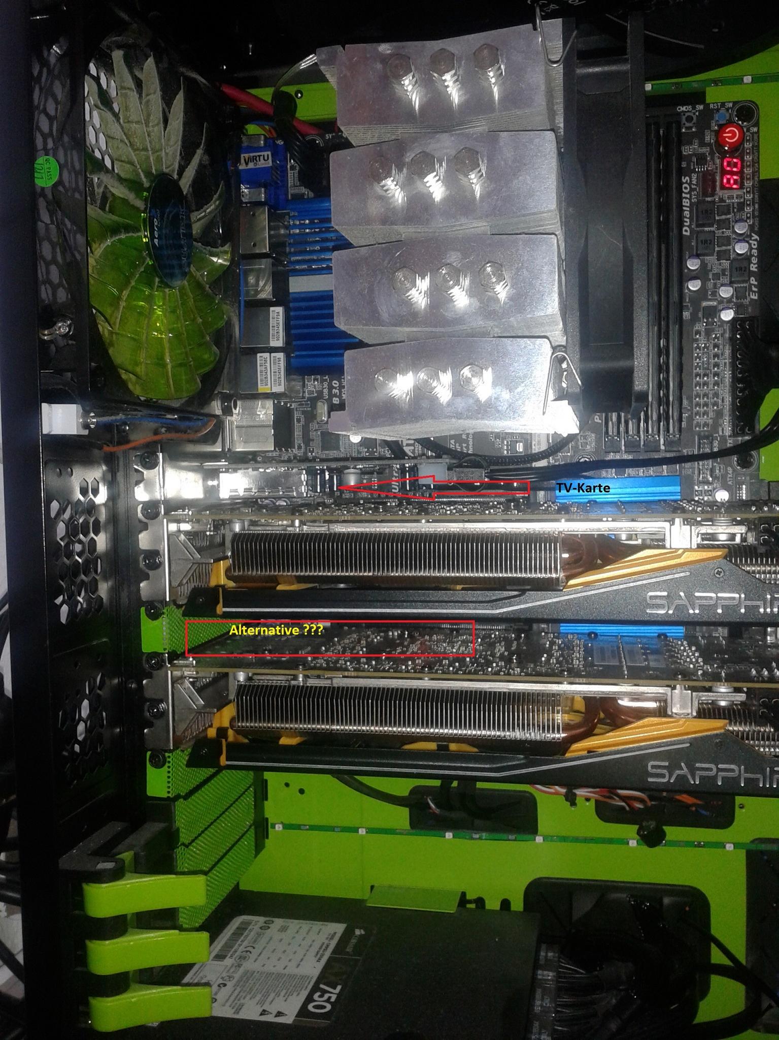 Aber mit der Temperatur muss ich mal schauen weil die TV-Karte direkt über den Grafikkarten und direkt unter dem CPU-Kühler ist also die Hitze der zwei Grafikkarten und teilweise die des CPUs. Aber anders wäre Sie genau zwischen den zwei Grafikkarten.