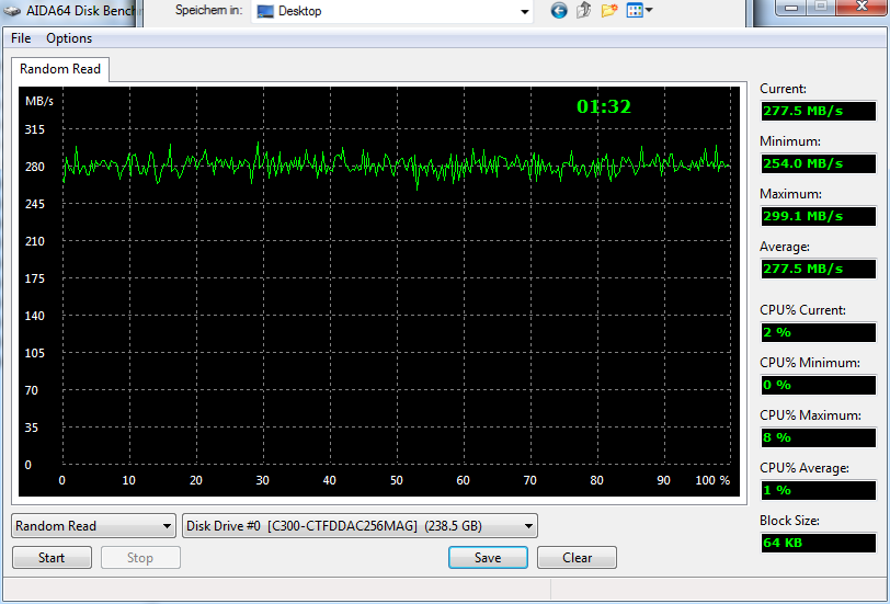 Was für eine HW ist das? Der Bench mit den 296MB/s bei 4k_64 Write ist seltsam, da hat wohl der Write Cache zugeschlagen, denn gewöhnlich liegt dieser Werte nicht über dem des seq. Schreibens und für eine C300 256GB ist der auch zu hoch.