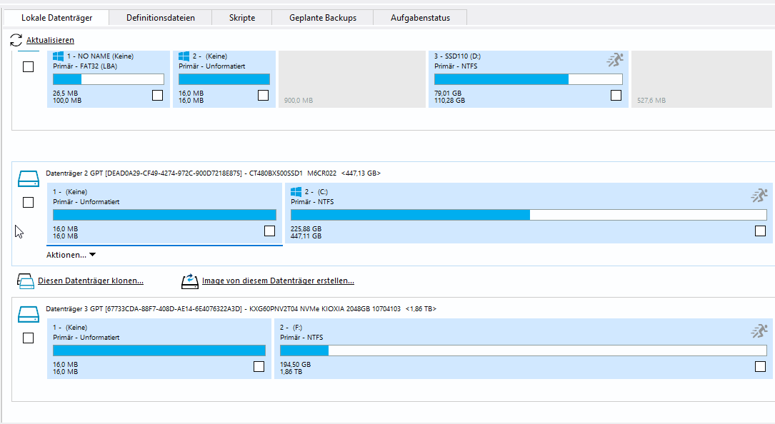Wie ich es vermutet hatte, musst du zwei DurchgÀnge machen. Zuerst klonst du von DatentrÀger 1 Partition 1 und 2.Tekkie schrieb:Dort kann ich keine 100MB Partition auswÀhlen....was nun?