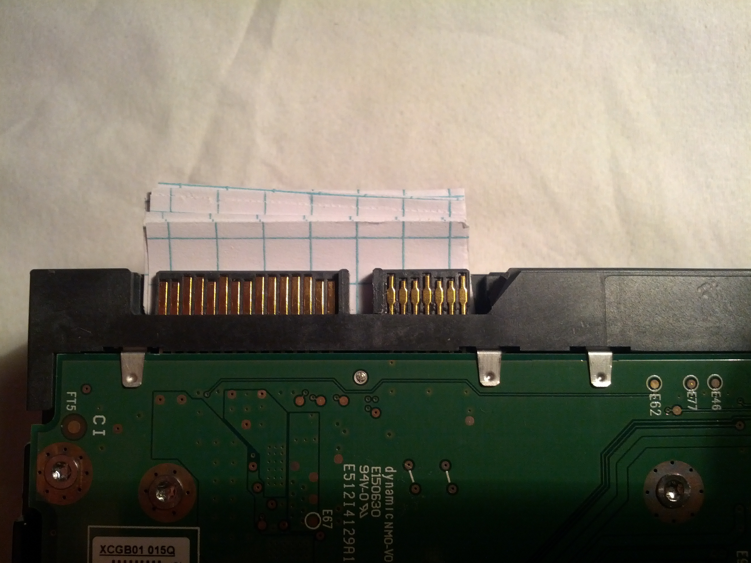 - Vorsichtig ein SATA-Kabel angeschlossen. Die Drähte wirkten zwar lose, konnten aber durch die Unterstützung von unten durch das Plastikplättchen genau in das Kabel eingeführt werden. Ich hatte noch versucht, das Kabel ein wenig mit dem gekauften Panzeband zu stabilisieren, aber es war einfach nicht genug Raum dafür und ich hätte mit mehr den Anschluss mit Kabel nur belastet (denke ich).