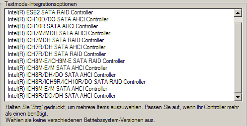 Welchen Textmode-Treiber muss ich nun genau integrieren? Habe die Diskettenversion "Floppy Configuration Utility for Intel® Matrix Storage Manager“ für XP geladen. Nur jetzt tauchen verschiedenste Möglichkeiten auf (siehe Anhang).