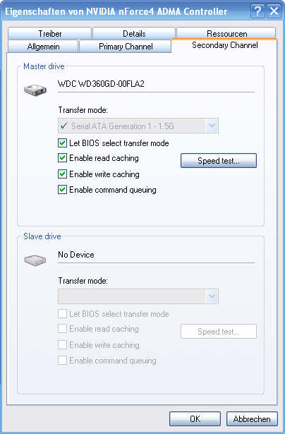 ich habe eine neue Festplatte eingebaut, und zwar eine "WDC WD200JS-98MHB0" mit SATA2-Anschluss. Ich verwende als Mainboard das Asus A8N SLI-Deluxe, das hat ja die SATA2-Controller von NVidia (NForce 4). Meine erste Platte mit NCQ von Maxtor hat im Gerätemanager (im Controller-Menü) die Checkbox "Enable command queuing", welches auch aktiviert ist.