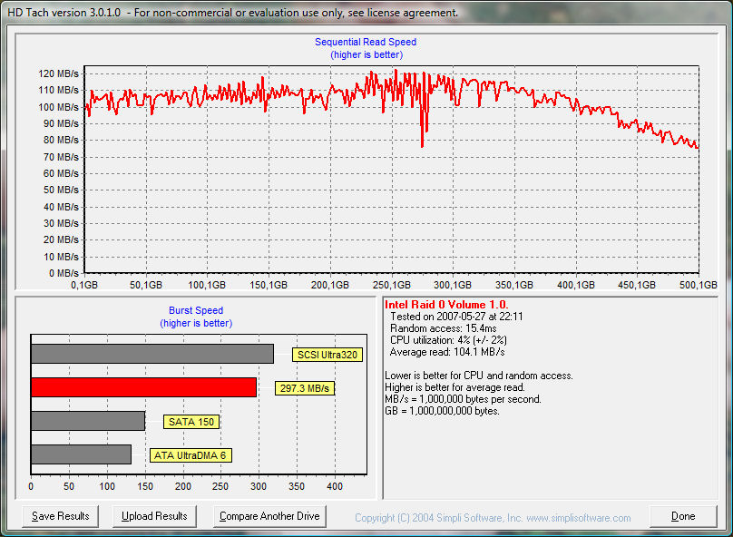 Zum einen eignen sich Low-Level-Benchmarks wie HD-Tach und HD-Tune denkbar schlecht um die Leistung eines RAID-0 Verbundes zu messen, da sie mit festen Blockgrößen arbeiten und bei bestimmten Konfigurationen (Stripe-Size) ins schleudern geraten. Die Ergebnisse sind nicht selten unzuverlässig. Ganz davon abgesehen sind die Ergebnisse nicht direkt auf die Praxis übertragbar, da weder die sequenzielle Transferrate in Zusammenhang mit der mittleren Zugriffszeit gebracht wird, noch die Cache-Algorithmen und ansonstigen Firmware-Optimierungen in irgendeiner Weise berücksichtigt werden.