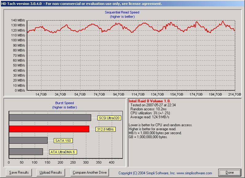 Was die Zugriffszeit betrifft, das liegt auch wieder an deinem Matrix RAID. Der RAID-0 Verbund befindet sich auf der schnelleren Hälft, wodurch die Wege für die Köpfe kürzer sind. Diese mittlere Zugriffszeit hättest du innerhalb dieses Kapazitätsfensters genauso, wenn du das RAID-0 über die gesamte Kapazität erstellt hättest. Mit dem Unterschied, dass HD-Tach und HD-Tune die "durchschnittliche" Zugriffszeit über die gesamte Kapazität ermittelt und dabei natürlich auch den hinteren Bereich miteinbezogen hätten, wodurch das Ergebnis höher ausfällt.