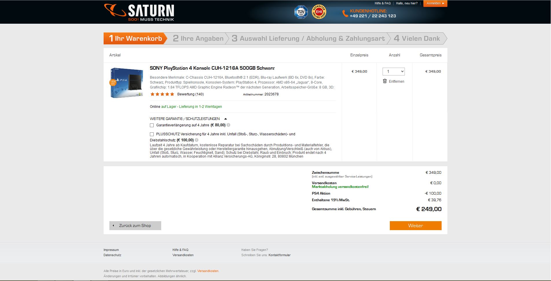 Bis nächste Woche Mittwoch (07.09.16) bekommt man 100€ direkt abgezogen bei einem Kauf einer PS4. Funktioniert Online (Direktabzug im Warenkorb) wie auch im Markt selbst.