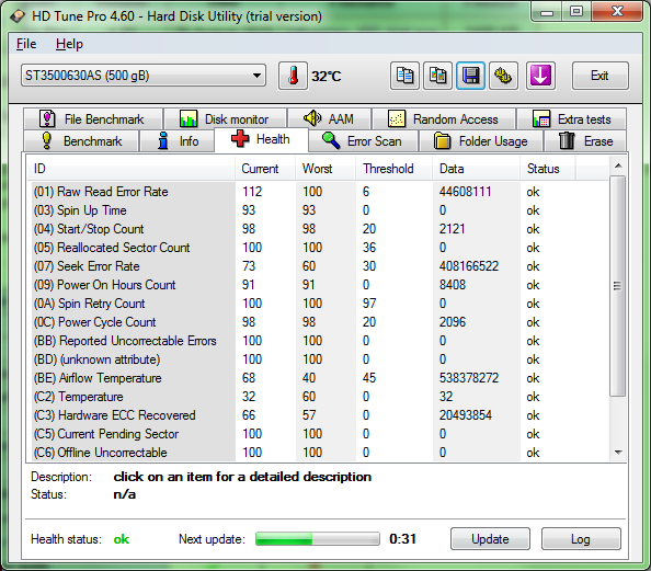 Wie sehen die SMART-Werte für die Festplatte aus? Kann man auch mit HDTune auslesen