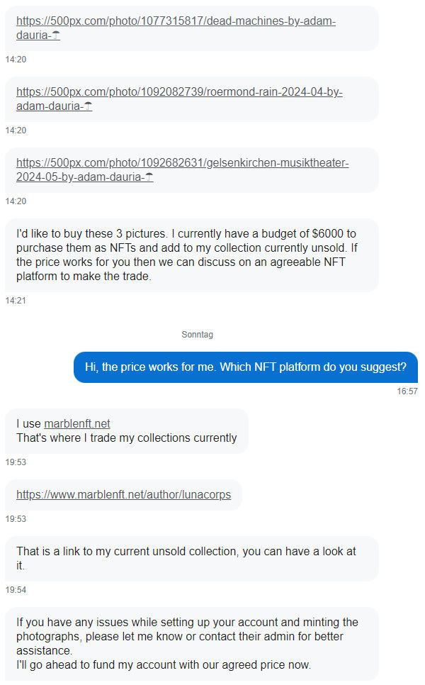 ich wurde vor ein paar Tagen auf 500px.com von einem gewissen User angeschrieben, der mir ungewöhnlich viel Geld für 3 meiner Bilder bietet. Er möchte diese als NFT kaufen. Ich verkaufe zwar immer mal wieder meine Fotos als Print über 1x.com und anderen Foto-Communities, aber so eine hohe Summe wie er sie mir bietet, ist mir doch irgendwie verdächtig... es ist irgendwie zu schön, um wahr zu sein: